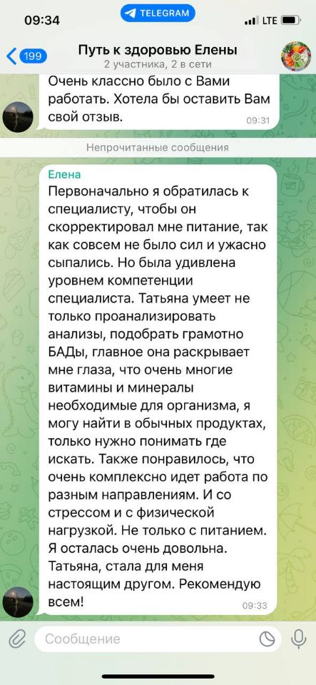 «Очень классно было с вами работать. Первоначально я обратилась к специалисту, чтобы он скорректировал мне питание, так как совсем не было сил и ужасно сыпались волосы. Но была удивлена уровнем компетенции специалиста. Татьяна умеет не только проанализировать анализы, подобрать грамотно БАДы, главное она раскрывает мне глаза, что очень многие витамины и минералы необходимые для организма, я могу найти в обычных продуктах, только нужно понимать где искать. Также понравилось, что очень комплексно идет работа по разным направлениям. И со стрессом и с физической нагрузкой. Не только с питанием. Я осталась очень довольна. Татьяна, стала для меня настоящим другом. Рекомендую всем!»