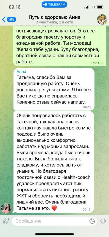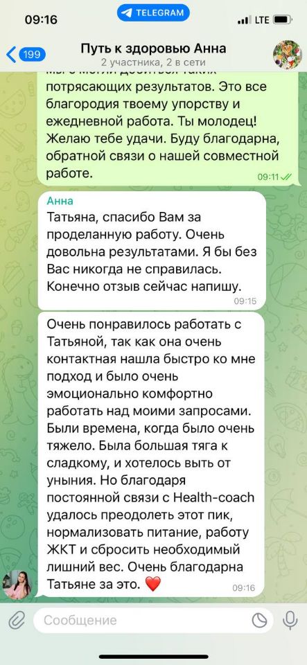 «Очень понравилось работать с Татьяной, так как она очень контактная нашла быстро ко мне подход и было очень эмоционально комфортно работать над моими запросами. Были времена, когда было очень тяжело. Была большая тяга к сладкому, и хотелось выть от уныния. Но благодаря постоянной связи с Health-coach удалось преодолеть этот пик, нормализовать питание, работу ЖКТ и сбросить необходимый лишний вес. Очень благодарна Татьяне за это ❤️»