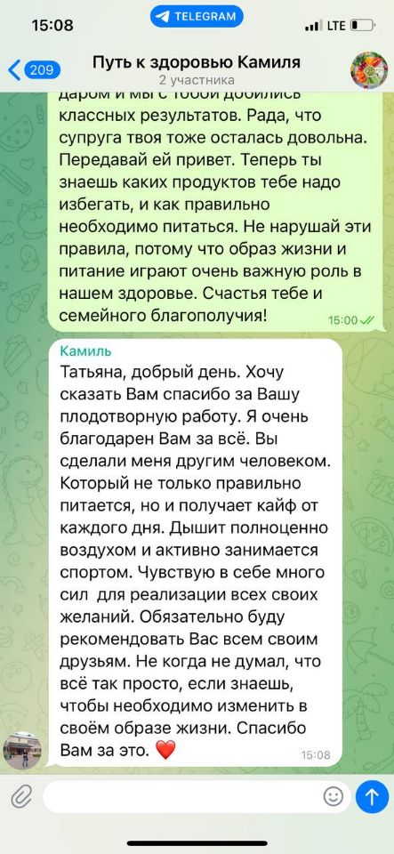 «Хочу сказать Вам спасибо за Вашу плодотворную работу. Я очень благодарен Вам за всё. Вы сделали меня другим человеком. Который не только правильно питается, но и получает кайф от каждого дня. Дышит полноценно воздухом и активно занимается спортом. Чувствую в себе много сил для реализации всех своих желаний. Обязательно буду рекомендовать Вас всем своим друзьям. Не когда не думал, что всё так просто, если знаешь, что необходимо изменить в своем образе жизни. Спасибо Вам за это ❤️»