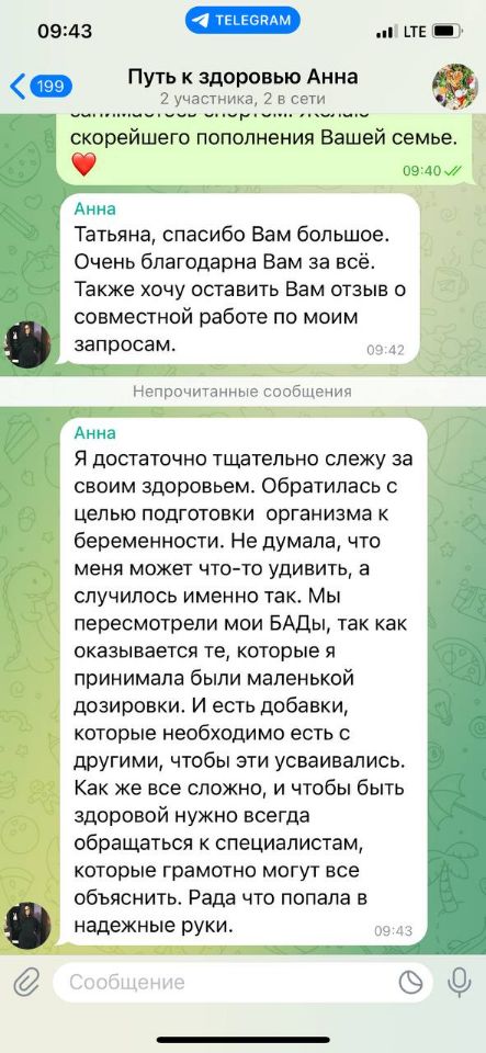 «Татьяна, спасибо Вам большое. Очень благодарная Вам за всё. Также хочу оставить Вам отзыв о совместной работе по моим запросам. Я достаточно тщательно слежу за своим здоровьем. Обратилась с целью подготовки организма к беременности. Не думала, что меня может что-то удивить, а случилось именно так. Мы пересмотрели мои БАДы, так как оказывается те, которые я принимала были маленькой дозировки. И есть добавки, которые необходимо есть с другими, чтобы эти усваивались. Как же все сложно, и чтобы быть здоровой нужно всегда обращаться к специалистам, которые грамотно могут все объяснить. Рада что попала в надежные руки»